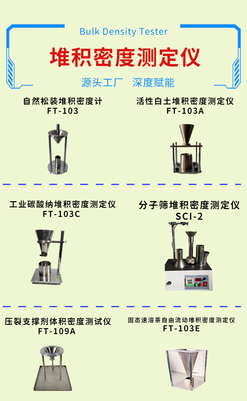 例舉FT-102E粉末流動性測試儀就是一款專門為解決這些問題的推薦機型,所使用的儀器稱為堆積密度測定儀,用于分析粉體顆粒物的工藝性能的評價方法所使用的儀器稱為堆積密度測定儀,用于分析粉體顆粒物的工藝性能的評價方法所使用的儀器稱為堆積密度測定儀,用于分析粉體顆粒物的工藝性能的評價方法所使用的儀器稱為堆積密度測定儀,用于分析粉體顆粒物的工藝性能的評價方法