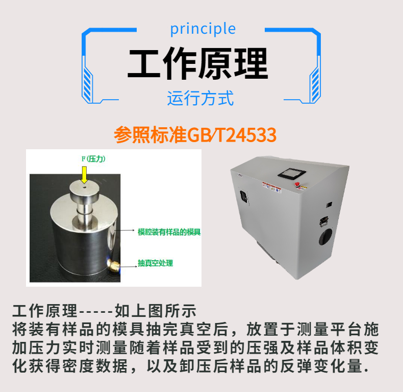工作原理:將裝有樣品的模具抽完真空后,放置于測量平臺施加壓力,并實時測量隨著樣品收到的壓強(qiáng)及樣品體積變化獲得密度,以及卸@壓后獲得反彈變化量.