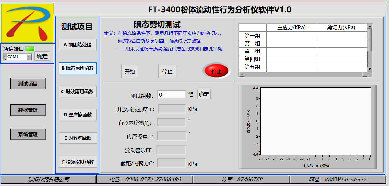分析和測試如下數據:莫爾應力圓、內摩擦角、主應力、剪切力、屈服軌跡、穩態流、流動函數、開放屈服強度(無側限屈服強度)、內摩擦時間角、時效屈服軌跡、堆積密度、密度軌跡、壁摩擦角、附著力、壁剪切力、壁應力、壁軌跡、運動摩擦角、靜態摩擦角、料倉設計的料斗半頂角、卸料口徑、流與不流判定、流動因子、初始抗剪強度(內聚力)等數據分析.